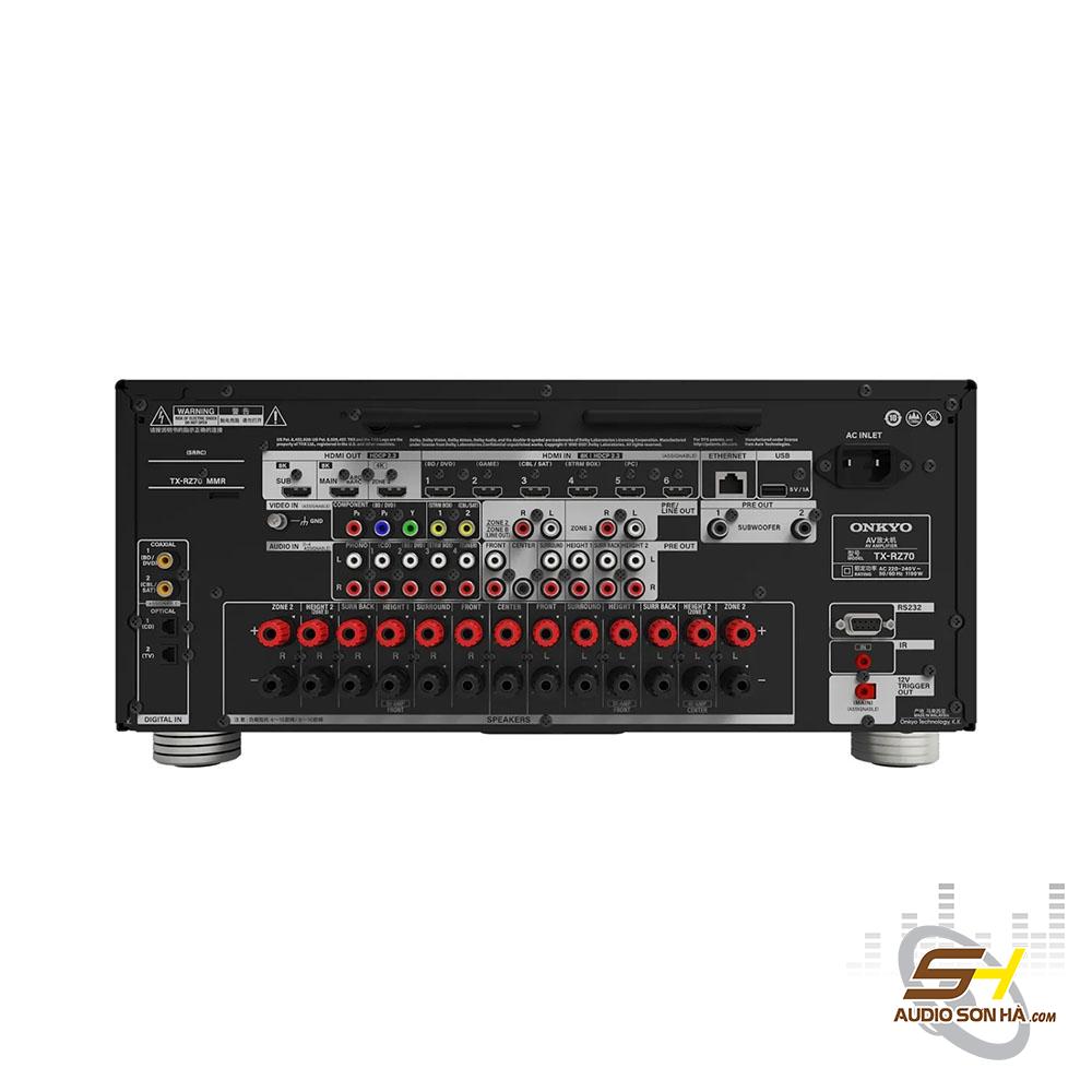 Amply Onkyo TX-RZ70 hỗ trợ cả kết nối không dây (Wi-Fi, Bluetooth) và có dây đa dạng, giúp người dùng linh hoạt trong việc thiết lập hệ thống giải trí tại gia. Các cổng kết nối bao gồm: 7 HDMI, 4 RCA, 1 RCA Phono, 2 Optical, 2 Coaxial, 13 ngõ ra tiền khuếch đại RCA (trong đó có 2 ngõ dành riêng cho loa subwoofer độc lập), cùng các cổng Zone 2 Stereo RCA và Zone 3 Stereo RCA.