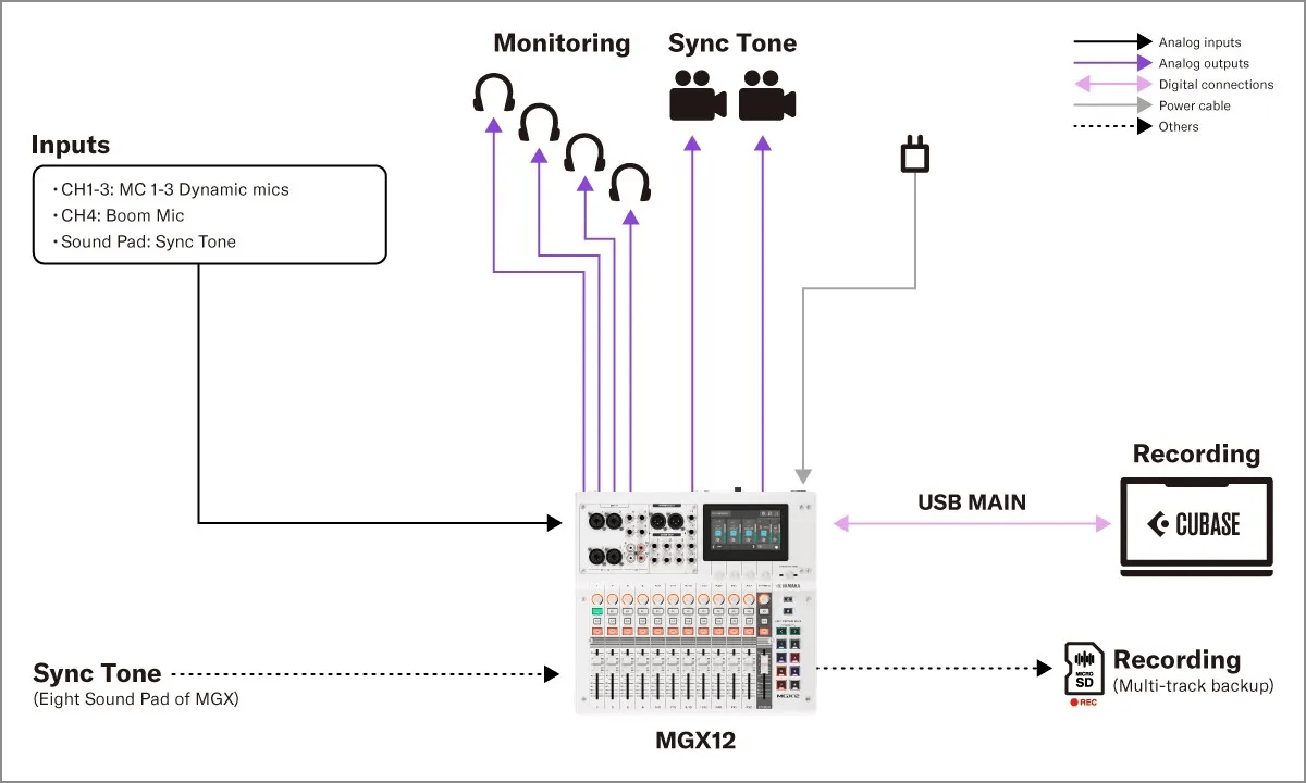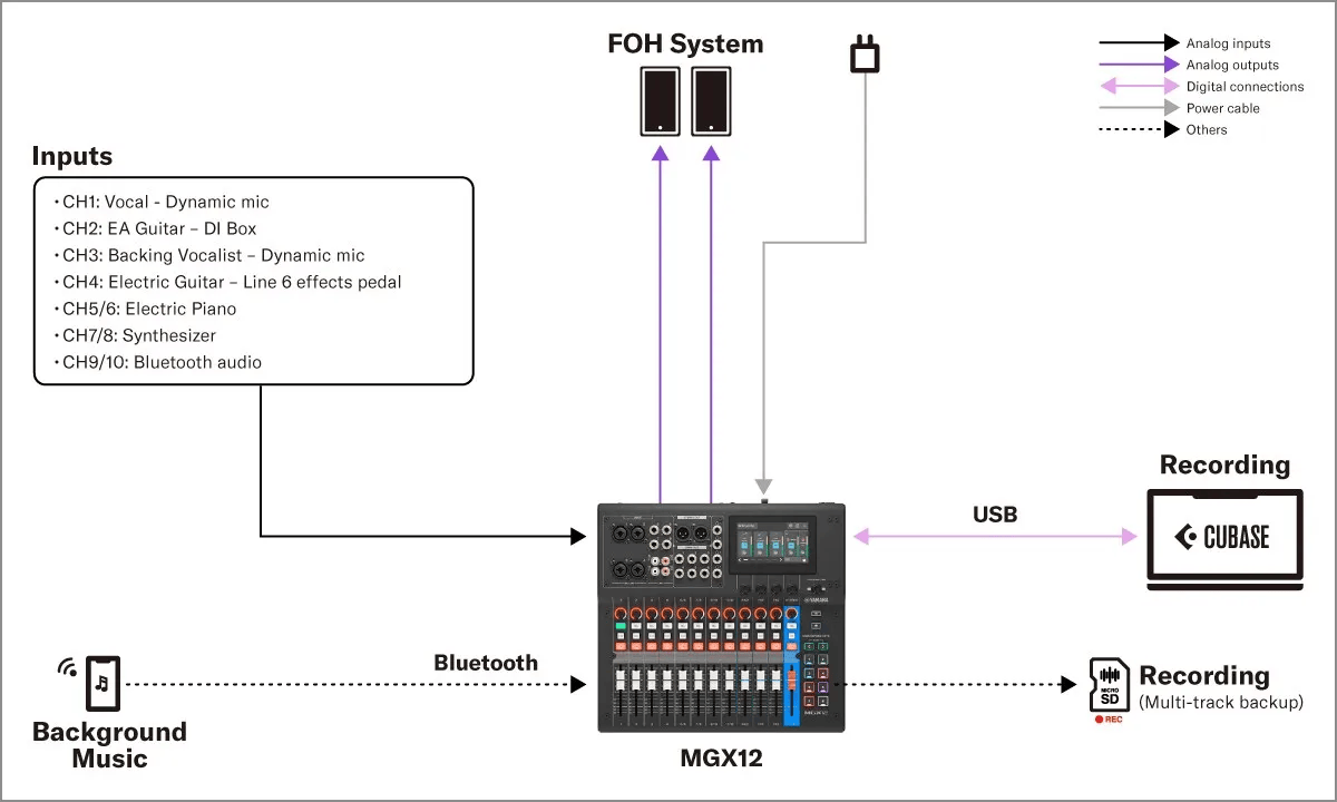 Bàn mixer Yamaha MGX12 được thiết kế như một hub âm thanh đa chức năng. Nó có thể kết nối, routing và xử lý linh hoạt giữa nhiều thiết bị và nền tảng khác nhau, đáp ứng trọn vẹn các mô hình âm thanh hiện đại.
