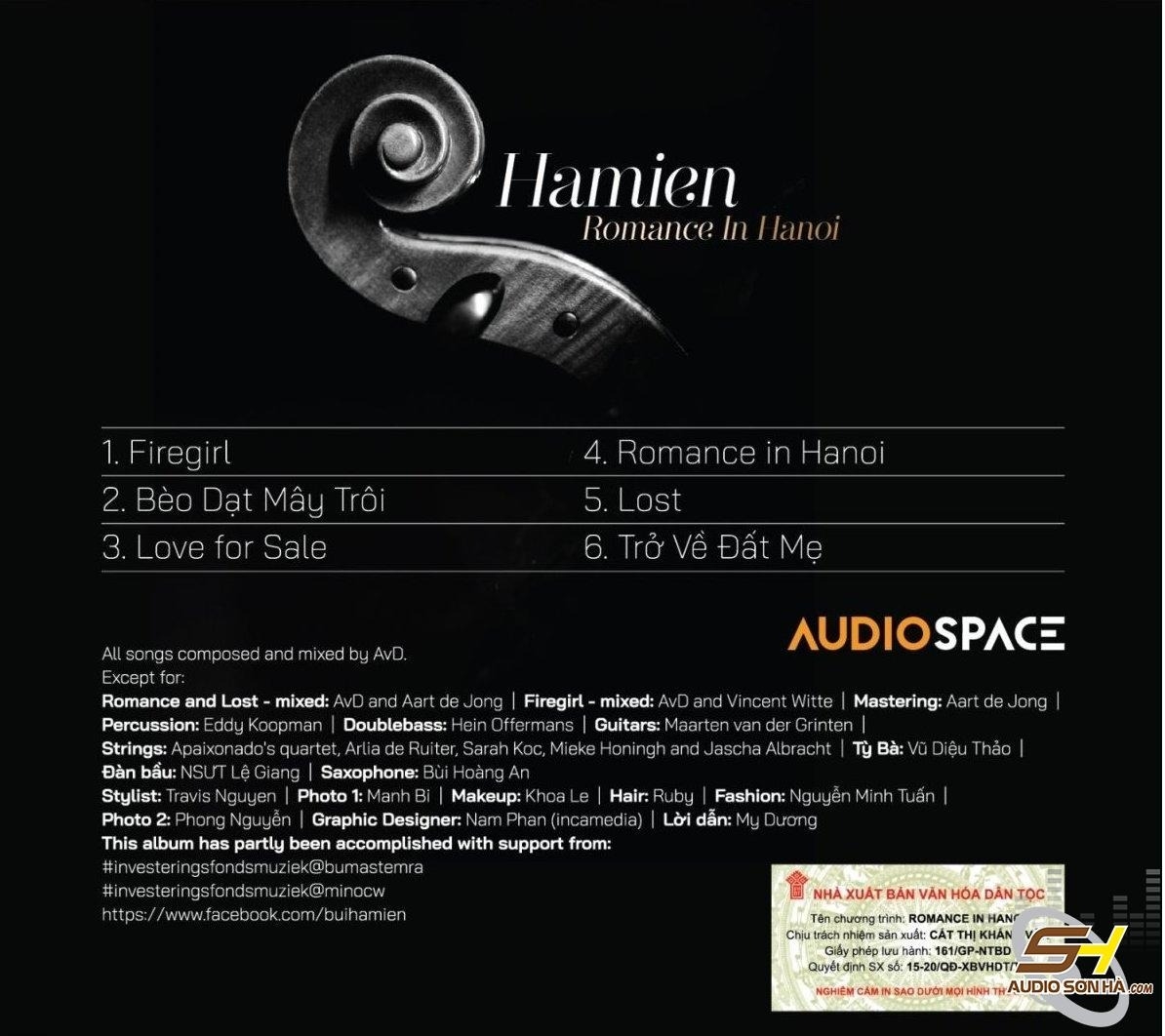 Album "Romance in Ha Noi" có 4 bản nhạc do nhạc sĩ người Hà Lan - Ad van Dongen (nghệ danh AvD) sáng tác mới, mang phong cách nhạc phim và cổ điển giao thoa cùng 2 bản nhạc Việt Nam quen thuộc, đó là: "Firegirl", "Love for sale", "Romance in Ha Noi", "Lost", "Bèo dạt mây trôi", "Trở về đất mẹ".