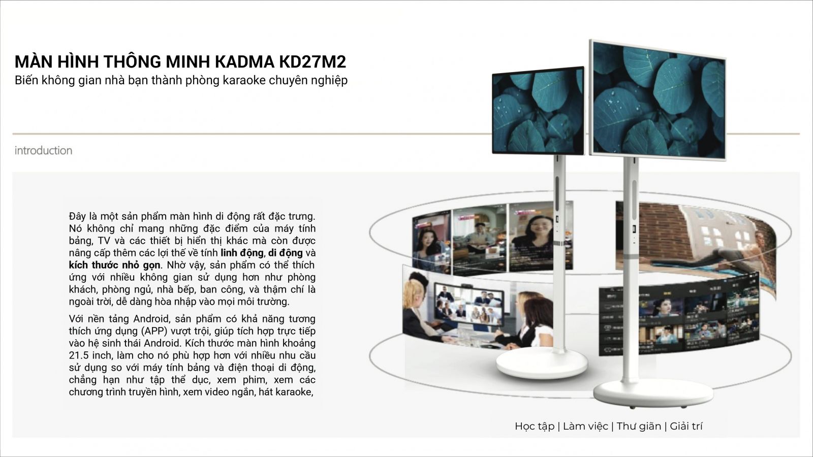 Đây là một sản phẩm màn hình di động rất đặc trưng, không chỉ có đặc điểm của máy tính bảng, tivi và các thiết bị hiển thị khác mà còn tăng thêm ưu điểm về tính di động, tính cơ động và kích thước nhỏ, do đó có thể thích ứng với nhiều tình huống ứng dụng hơn, phòng khách, phòng ngủ, nhà bếp, ban công và thậm chí ngoài trời, có thể tích hợp rất tốt vào không gian và nền tảng Android có khả năng tương thích APP tuyệt vời. Do đó có thể tích hợp trực tiếp vào chuỗi sinh thái Android.