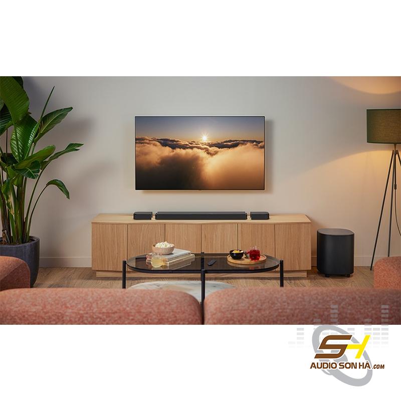 Toàn bộ hệ thống được hoàn thiện với tông màu đen sang trọng, giúp chiếc loa Soundbar tivi này trở thành điểm nhấn trong phòng khách hoặc phòng phim tại gia. Các loa vệ tinh có thể tháo rời và kết nối không dây, vừa đảm bảo thẩm mỹ vừa mang lại sự linh hoạt tối đa khi sử dụng.