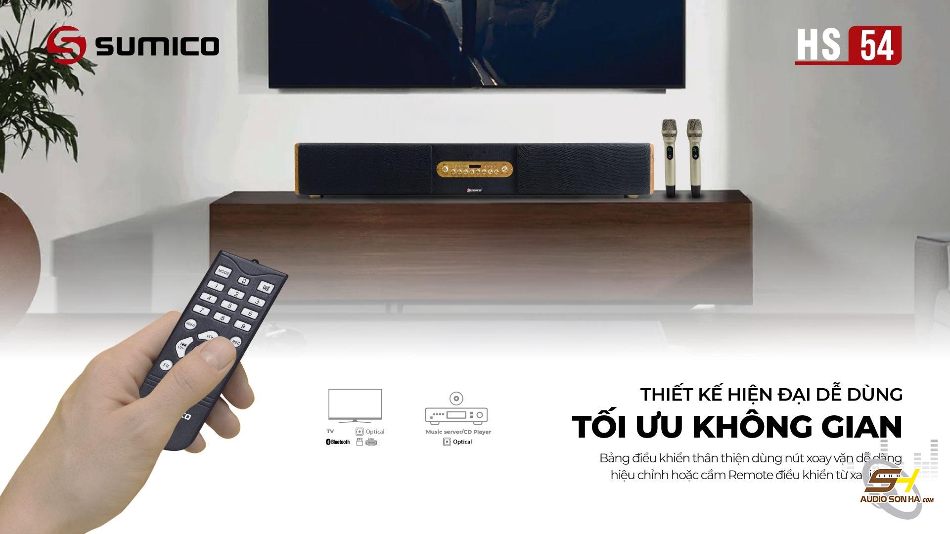 Sumico HS54 là mẫu loa All in One (Tất Cả trong Một), được thiết kế dạng loa soundbar loại lớn, cho âm thanh mạnh mẽ sống động trung thực như một bộ dàn Hi-Fi thực thụ. Loa đa dạng kết nối Bluetooth, AUX, HDMI ARC, Optical, USB, trang bị 2 Micro không dây. Hình thức sang trọng với thùng loa bọc da vân đen và ốp gỗ sồi đem lại vẻ đẹp dài lâu cho căn phòng của bạn. Với tổng cộng 6 củ loa chất lượng cao, Sumico HS54 cho âm thanh trầm ấm và rõ nét, âm Bass mạnh mẽ không cần trang bị thêm loa Subwoofer. Sumico HS54 đáp ứng nhu cầu nghe nhạc, xem phim và karaoke cho phòng khách gia đình có diện tích từ 15m² - 45m².