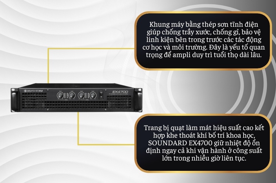 Trang bị quạt làm mát hiệu suất cao kết hợp khe thoát khí bố trí khoa học, bộ tăng âm điện SOUNDARD EX4700 giữ nhiệt độ ổn định ngay cả khi vận hành ở công suất lớn trong nhiều giờ liên tục.