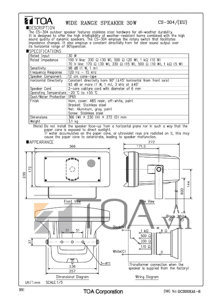 - Loa nén dải rộng chống nước TOA CS-304 được thiết kế với vành loa (CS-64) và vành định hướng âm ổn định (CS-154/CS-304) giúp nâng cao khả năng định hướng của loa