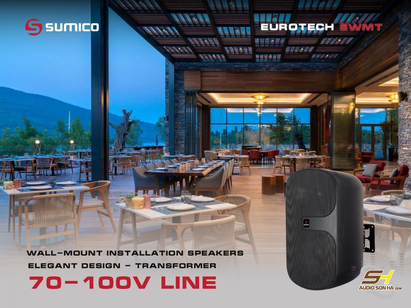 Loa treo tường cao cấp Sumico EUROTECH 6WMT thiết kế sang trọng, tích hợp biến áp 70/100V, sở hữu Woofer 6 inch (15.24cm) đặc chế công suất lớn, lý tưởng cho bar club, câu lạc bộ, phòng gym, cửa hàng, shop house, quán café, nhà hàng, rooftop...