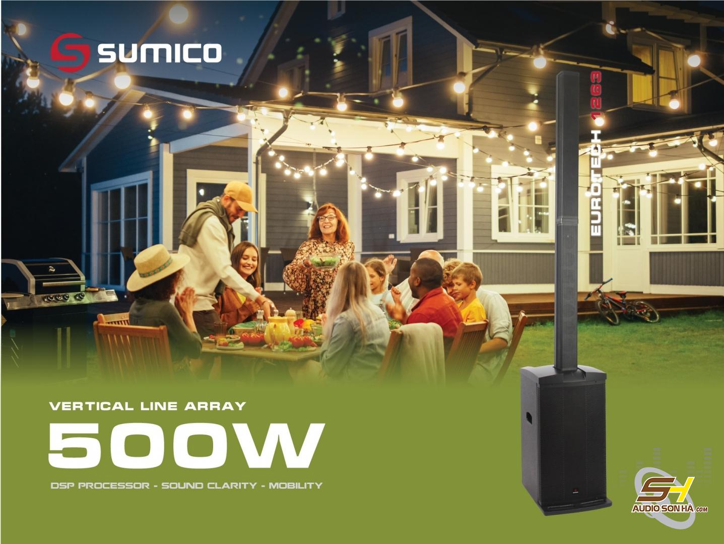 Trang bị ampli Class D và Mixer tích hợp DSP hiệu suất cao gắn trong loa, hệ thống loa cột Sumico EUROTECH 1083 cao 2.2 mét này đạt công suất thực 500W RMS với cường độ âm thanh tối đa 122dB (128dB peak) hoàn toàn có thể đảm nhận vai trò của một dàn loa sân khấu mini trong không gian 100–150m² mà không cần thêm ampli rời. Mixer tích hợp trên loa hiệu chỉnh âm lượng và âm sắc Bass/Treble và Reverb cho đường Micro/Line in, hiệu chỉnh riêng biệt âm lượng cho loa thanh cột (Main Vol) và âm lượng cho loa Subwoofer (Sub Vol)...