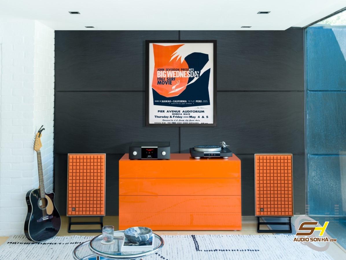 - Thiết kế cổ điển bao phủ bằng gỗ óc chó và lưới xốp Quadrex độc đáo với ba màu đen, cam,xanh lam phù hợp với mọi không gian nghe nhạc