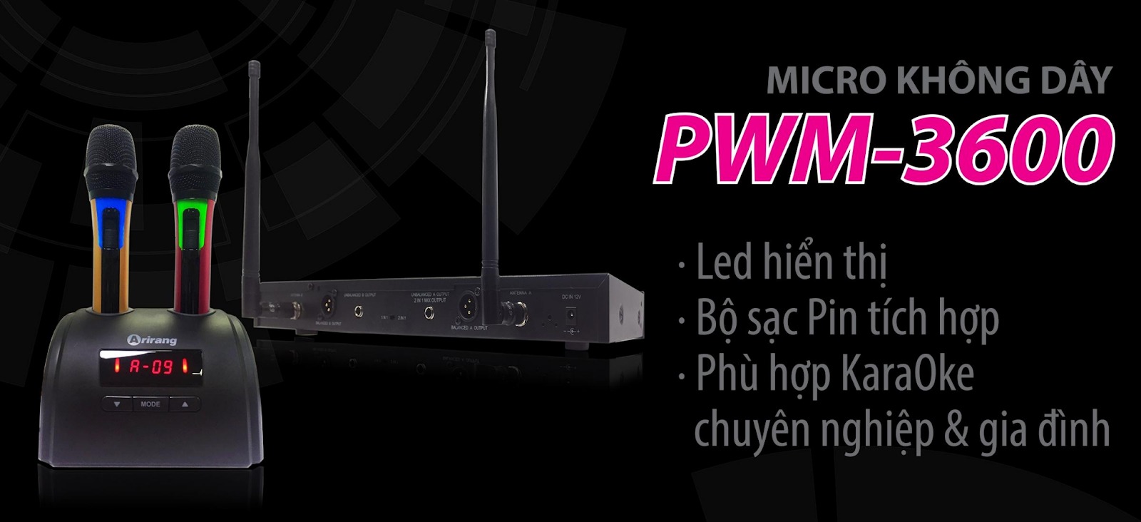 - Thích hợp cho Karaoke chuyên nghiệp và gia đình. Micro Arirang PWM-3600 không chỉ phù hợp cho Karaoke hộ gia đình mà với chức năng chuyên nghiệp, bạn có thể sử dụng Micro trong các hội thảo, dạy học,...