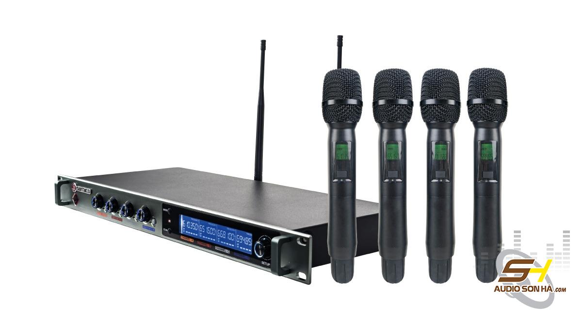 Bộ Micro không dây 4 kênh Sumico WMS4H cao cấp với 4 tay Micro lý tưởng cho làm sự kiện, hội trường, phòng trà ca nhạc và sân khấu nhỏ, tổ chức chương trình biểu diễn có 2 MC và 2 ca sĩ hát live cần hệ thống Micro tinh gọn...Trang bị băng tần UHF có công suất thu phát sóng cực mạnh cho khả năng hoạt động xuyên tường tối ưu trong phạm vi lên đến 30m. Công nghệ tự động chống hú, tự động tìm kiếm kênh tín hiệu tốt nhất, kết hợp kỹ thuật nén - giải nén tiên tiến giúp loại bỏ nhiễu âm và ngắt quãng đảm bảo âm thanh luôn ổn định và sạch trong.