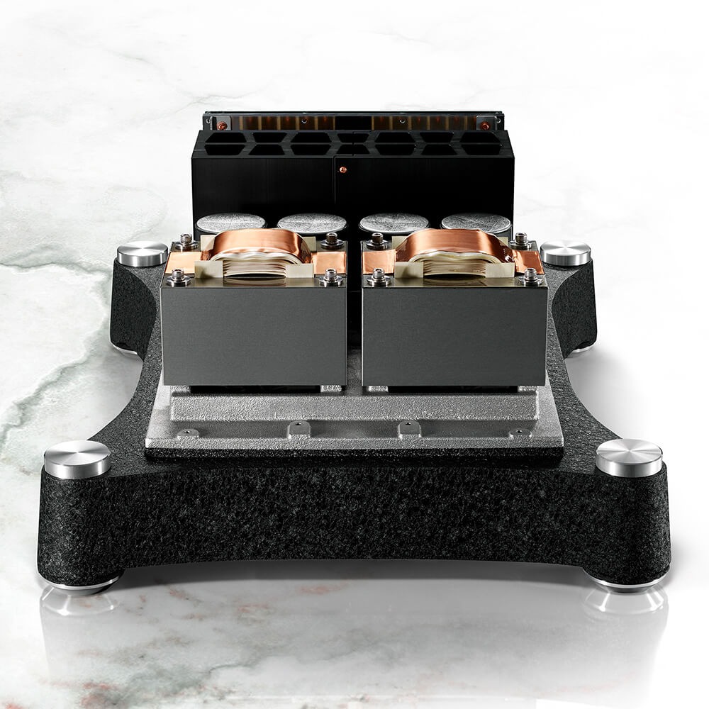 Nhiều năm kinh nghiệm của chúng tôi trong việc đạt được chất lượng âm thanh và độ tin cậy đã được thể hiện qua hai biến áp nguồn khổng lồ với tổng công suất 2,8 kVA. Trong dây chuyền sản xuất M700 và M700S, các nghệ nhân được chứng nhận của chúng tôi quấn thủ công các tấm cách điện quanh lõi biến áp, loại bỏ nhu cầu sử dụng cuộn dây để tăng cường độ kết dính giữa cuộn sơ cấp và thứ cấp. Cuộn dây được kết nối trực tiếp với tầng khuếch đại đầu tiên để tăng độ tinh khiết của nguồn điện và đạt được khả năng tái tạo âm thanh nhạy bén và ổn định hơn. Ngoài ra, bốn tụ điện 33.000 μF chắc chắn được chế tạo riêng giúp mang lại âm thanh sống động và mượt mà với khả năng đáp ứng tức thời tuyệt vời, đúng như mục tiêu thiết kế của M700 và M700S.